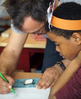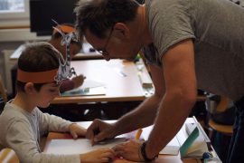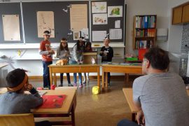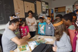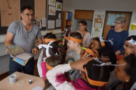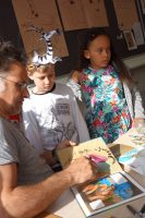 Avant la visite, nous étions très impatients de découvrir Yann Dégruel. Nous avons lu de nombreux livres de cet auteur-illustrateur, préparé une mise en boîte pour Saba et la plante magique, des questions, un jeu… Quand il est arrivé, il a été très surpris de nous voir avec les serre-têtes de la petite chèvre d’Abyssinie. Il était très sympa et a répondu à toutes nos questions. Mais surtout il nous a montré comment dessiner. Il dessine vraiment trop bien. Avec ses conseils et ses petits “trucs”, on a tous réussi à dessiner la chèvre et les autres animaux proposés par Yann. A la fin, il a dessiné et fait des dédicaces dans les livres que nous avons achetés pour notre bibliothèque de classe.