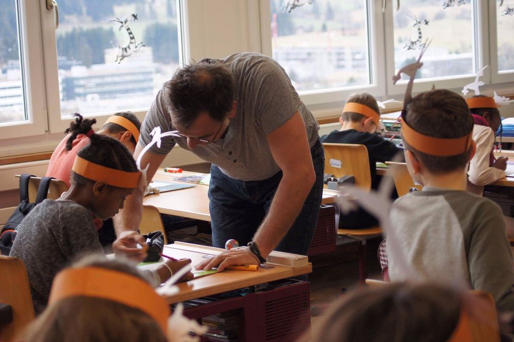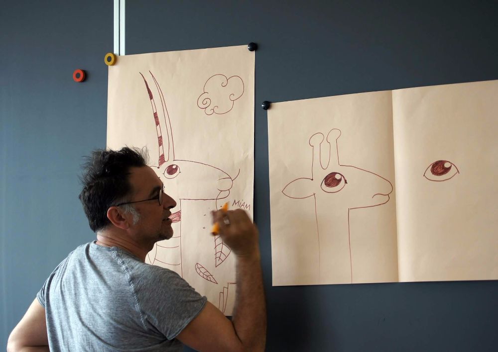Avant la visite, nous étions très impatients de découvrir Yann Dégruel. Nous avons lu de nombreux livres de cet auteur-illustrateur, préparé une mise en boîte pour Saba et la plante magique, des questions, un jeu… Quand il est arrivé, il a été très surpris de nous voir avec les serre-têtes de la petite chèvre d’Abyssinie. Il était très sympa et a répondu à toutes nos questions. Mais surtout il nous a montré comment dessiner. Il dessine vraiment trop bien. Avec ses conseils et ses petits “trucs”, on a tous réussi à dessiner la chèvre et les autres animaux proposés par Yann. A la fin, il a dessiné et fait des dédicaces dans les livres que nous avons achetés pour notre bibliothèque de classe.